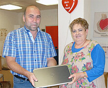 Den zweiten Hauptpreis erhält Anna Henschel mit ihrem Pflegedienst „Herz und Hand“ aus Duisburg. Aus den Händen des LfK-Vorstandsvorsitzenden Wolfgang Cohrs nahm sie einen nagelneuen Laptop entgegen.